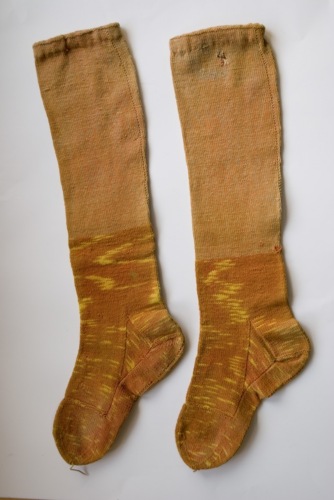 Calze da donna, arrivano sotto il ginocchio. Realizzate con cotone di colore arancione nel gambale e arancione più scuro con fiammature gialle nella parte inferiore del gambale e nel piede. Nel bordo superiore è inserito un elastico.