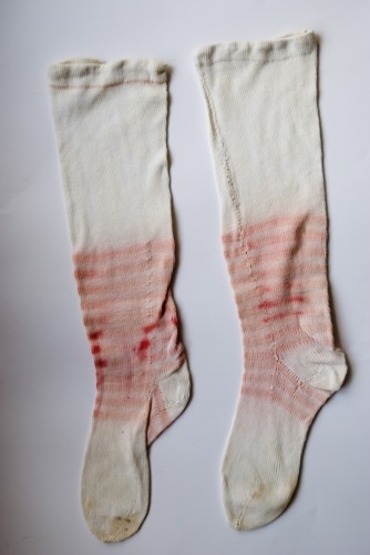 Calze da donna, arrivano sotto il ginocchio. Realizzate con cotone di colore bianco. Nella parte inferiore del gambale ci sono dodici righe realizzate con filo rosso. Nel bordo superiore è inserito un elastico.