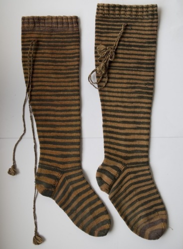 Calze da donna in cotone rosso e nero a righe alternate lavorate a ferri. Il bordo superiore è a coste, mentre il gambale e il piede sono a maglia rasata. Appena sotto il bordo sul gambale sono cuciti due lunghi cordoncini terminanti a fiocco.
