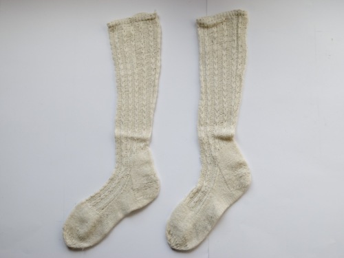 Calzini in lana bianca lavorata a ferri: il gambale è lavorato a treccine, il piede è lavorato a maglia rasata.