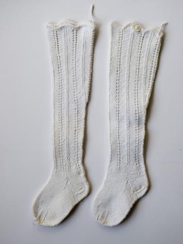 Calzini lunghi da bambino. Realizzati con cotone bianco lavorato a ferri. Il bordo termina con un motivo a cappe, al centro c'è un bottone in madreperla. Il gambale è lavorato con un motivo decorativo. Il piede è lavorato a maglia rasata.
