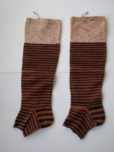 Calze da donna prive della punta. Sono realizzate con cotone lavorato a ferri; di colore melange bianco e rosso nel bordo e parte superiore del gambale, a righe alternate rosse e nere nelle parti restanti. Il bordo è lavorato a coste, il gambale e la soletta a maglia rasata.