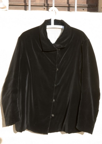 giacca in velluto nero con colletto a punte a doppio petto con abbottonatura femminile e nascosta. I quattro grandi bottoni per la chiusura sono metallici a pressione. All'interno in alto e in basso vi sono due bottoncini metallici a pressione per la chiusura. Il colletto è chiuso da un bottone in plastica nero tramite un'asola. All'interno la giacca è foderata con un tessuto di cotone marrone.