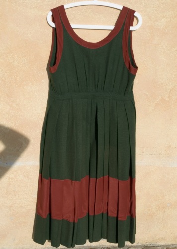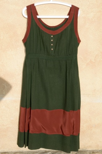 Scamiciato (abito senza maniche) da balia in lana verde composto da corpetto con scollo tondo, senza maniche, e da una lunga gonna plissettata. In vita una bassa (3 cm) cintura in lana verde; il bordo del corpetto è decorato con una striscia di seta rossa, con la stessa stoffa è stata cucita una fascia decorativa alta 20 cm sulla parte bassa della gonna. Il fondo della gonna all'interno è stato rinforzato con una fodera verde di tessuto sintetico. Sul dietro del corpetto la chiusura, che avviene tramite tre bottoni metallici a pressione, è nascosta, ma all'esterno si presenta con quattro piccoli bottoni in plastica con funzione decorativa. All'altezza della vita sul dietro corpetto e gonna si separano e si chiudono per metà tramite un gancetto metallico e quattro bottoncini in metallo a pressione per poter indossare e togliere agevolmente lo scamiciato.