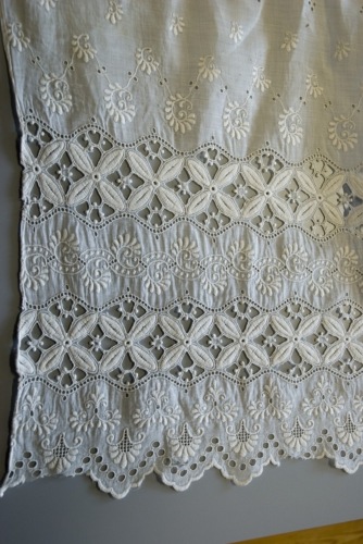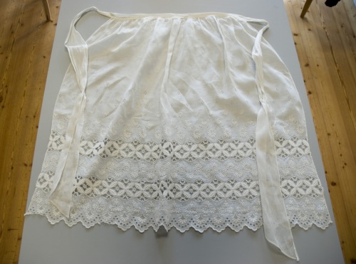 Grembiule in popelin di cotone bianco. Per l'intera metà inferiore il grembiule è ricamato a mano a punto a giorno e a punto pieno con motivi floreali. Il bordo è a cappette ricamate a punto pieno.