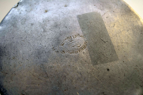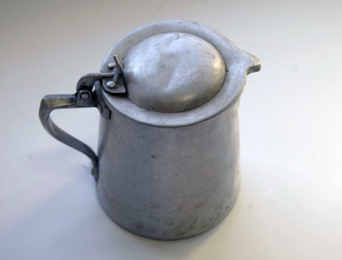 recipiente in alluminio a sezione circolare con base più larga rispetto alla bocca; dotata di beccuccio sul bordo superiore e di manico in ottone opposto ad esso. Il manico verticale e di forma arcuata, è fissato sotto il bordo superiore con borchie e trattiene in alto un perno mobile a cui è collegato il coperchio. Marchiatura a stampo sul fondo: ALLUMINIO LOMBARDO / ?EMONIESE PIEDIMULE? / AP