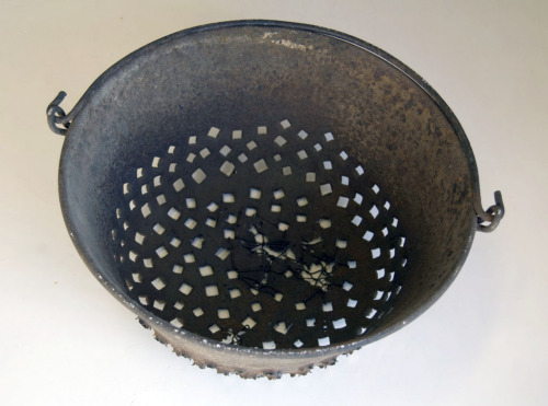 recipiente in ferro di forma svasata con fondo tondeggiante e bordo superiore ripiegato e arrotondato. Completo di manico in ferro ad arco, le cui estremità sono inserite in due anelli laterali, formati da bande in ferro modellate e fissate alla parete esterna dell'oggetto. Il fondo è completamente bucato da fori a sezione quadra, effettuati con un grosso chiodo. Parte del fondo sconnessa è stata consolidata con filo di ferro.