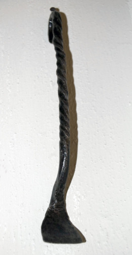 oggetto in ferro composto da un manico leggermente arcuato e attorcigliato su sè stesso, terminante ad un'estremità con un uncino e all'altra con una palettina a forma pressoché triangolare e leggermente rialzata.