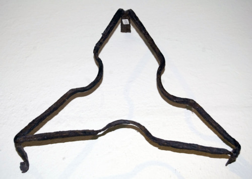 struttura in ferro a forma triangolare, con una rientranza concava alla metà di ogni lato, sorretta da 3 piedini posti ad ogni angolo. Due piedini presentano l'estremità inferiore leggermente rivolta verso l'alto.