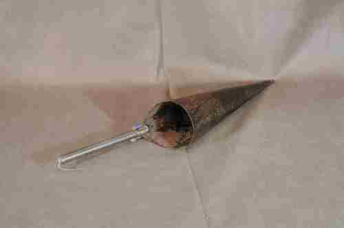Versatoio costituito da un tronco di cono di lamiera dotato di un forellino al vertice per far passare poca pece alla volta. Provvisto di manico in tondino di ferro (si tratta di un'aggiunta successiva).