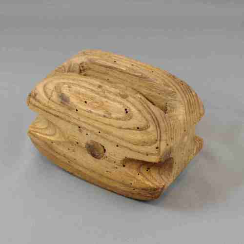 Bozzello in prima di piccole dimensioni, ricavato dal pieno per intaglio. Si tratta di un tipo di lavorazione precedente a quella che prevedeva l'unione di più pezzi di legno tramite inchiodatura o imbullonatura.