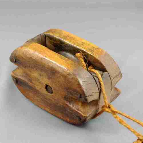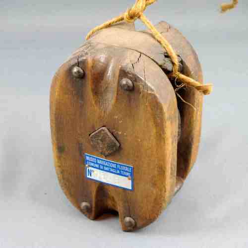 Bozzello in prima di piccole dimensioni, costruito unendo con quattro robusti chiodi diverse parti o settori in legno. Si tratta di un tipo di lavorazione più moderna rispetto a quella che prevedeva l'intaglio del bozzello da un unico pezzo di legno.