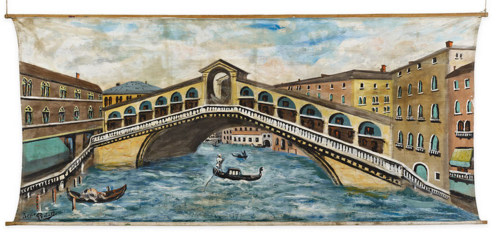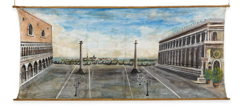 Il fondale di tela dipinta a tempera è inchiodato sui lati inferiore e superiore a dei listelli di legno agganciati alle estremità con del cordino.