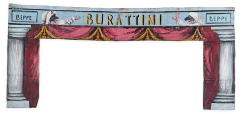 fronte del teatrino per burattini, detto #Arlecchino# (parte componente di un teatrino di burattini)