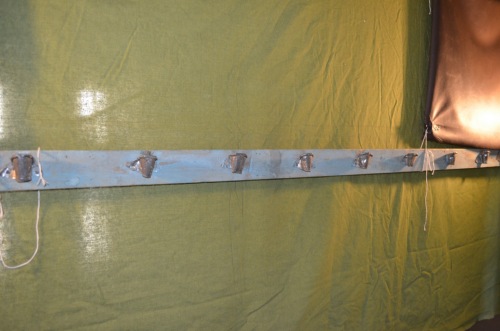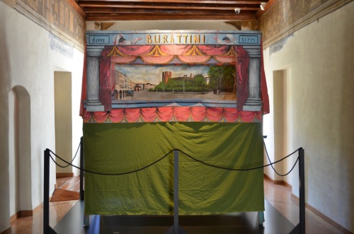 - FUNZIONE E MODALITÀ D'USO il teatrino seriva per celare la figura del burattinaio mentre questo animava i burattini e far visualizzare, tramite il fondale, lo scenario in cui era ambientata la rappresentazioneLa struttura era montata assemblando le assi tramite viti passanti e sistemi ad incastro. I teli esterni erano fissati con chiodi e cordini allintelaiatura predisposta. Sul fronte venivano appesi dei teli dipinti a tempera a incorniciare il boccascena. Mentre sul lato interno, parallelamente al boccascena erano appesi i teli, sempre dipinti a tempera, delle quinte e dei fondali. Sotto al boccascena e ai lati interni, dei piccoli coni di latta, fissati alle assi, erano usati per inserire il bastone di supporto dei burattini in attesa di essere fatti entrare in scena. Allinterno del teatrino si trovava anche una asticella con chiodi a cui erano appesi verticalmente i burattini a guanto, tramite il gancio posizionato sulla nuca di alcuni di essi. Al termine dello spettacolo la struttura era smontata e riportata a casa del burattinaio