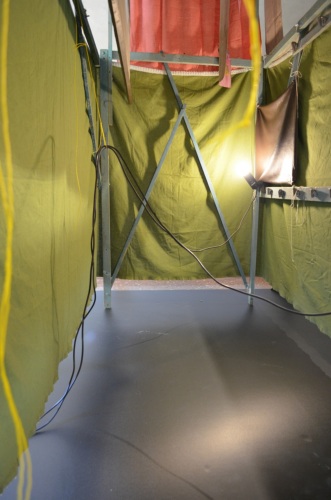 Teatrino composto da una ossatura smontabile di assi fissate tramite viti passanti o ad incastro. La struttura è coperta su tutti i lati da dei teli che lasciano libero solo il foro del boccascena.