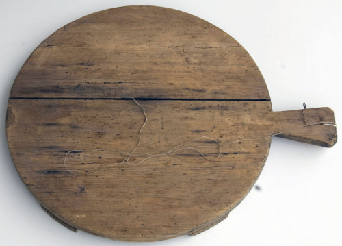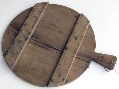 asse di legno di forma circolare con impugnatura di forma triangolare forata al centro, dove è fissato lo spago. Sul fondo due assicelle rettangolari in legno sono fissate con chiodi per rinforzare la fessurazione che taglia in due l'oggetto.
