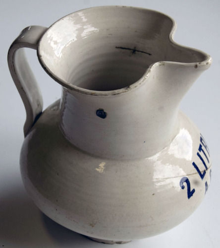 recipiente in terracotta a base circolare, di forma panciuta, smaltata allinterno e allesterno di colore bianco; dotato di un manico verticale e curvilineo posto sotto il bordo superiore arrotondato; di fronte ad esso beccuccio pronunciato. Iscrizione a lettere stampatelle in colore blu: 2 LITRI / A.G