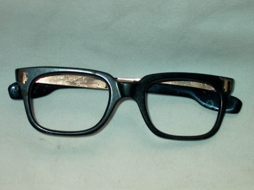 Gli occhiali hanno la mascherina in celluloide nera e le astine in metallo colorato oro e terminali sempre in celluloide nera. [Descrizione estratta dal database del Museo dell'Occhiale].