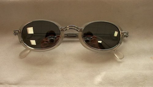Questi occhiali montano lenti ovali grigie ed oculari in materiale sintetico colorato in grigio; tutto il resto della montatura è in metallo bianco. All'esterno le lenti sono specchiate. [Descrizione estratta dal database del Museo dell'Occhiale].