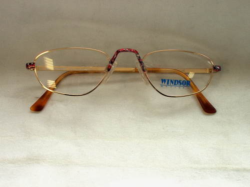 Gli occhiali in metallo colorato oro portano il nasello ed i piccoli laterali rivestiti di una pellicola multicolore. All'interno dell'astina sinistra: R 154 56-16 902 140 All'interno dell'astina destra: 140 Mimmina Made in Italy CE All'esterno delle astine: Mimmina Sulla lente sinistra: Windor Optical. [Descrizione estratta dal database del Museo dell'Occhiale].