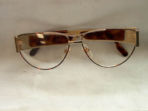 Gli occhiali da sole sono in metallo colorato oro e riportano una banda in materiale sintetico colorato ad effetto tartaruga, molto grande sulle astine. [Descrizione estratta dal database del Museo dell'Occhiale].