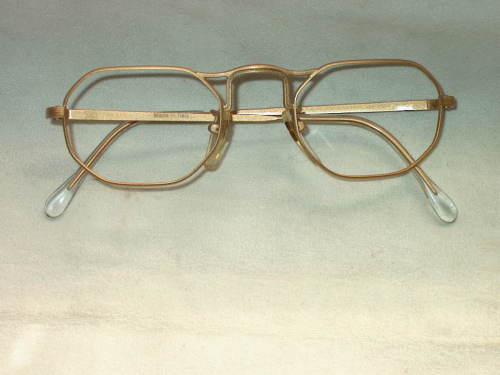 Gli occhiali, in metallo colorato oro pallido, recano all'interno dell'astina destra: Made in Italy e portano oculari dalla forma ottagonale. [Descrizione estratta dal database del Museo dell'Occhiale].