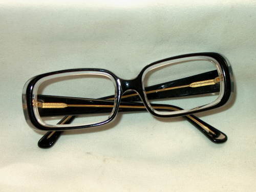 Gli occhiali in materiale sintetico trasparente all'interno e nero all'esterno montano lenti rettangolari. [Descrizione estratta dal database del Museo dell'Occhiale].
