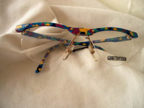 Gli occhiali sono in materiale sintetico colorato tipo arlecchino. Recano punzoni all'interno dell'astina sinistra e dell'astina destra e sulla lente sinistra. [Descrizione estratta dal database del Museo dell'Occhiale].