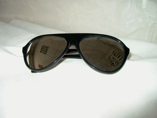 Gli occhiali, in materiale sintetico colorato nero, portano le lenti a specchio. Recano punzoni all'interno dell'astina sinistra ed all'interno dell'astina destra. [Descrizione estratta dal database del Museo dell'Occhiale].