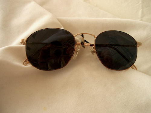 Gli occhiali, in metallo, montano lenti colorate in grigio - azzurro. I terminali delle astine recano un punzone. [Descrizione estratta dal database del Museo dell'Occhiale].