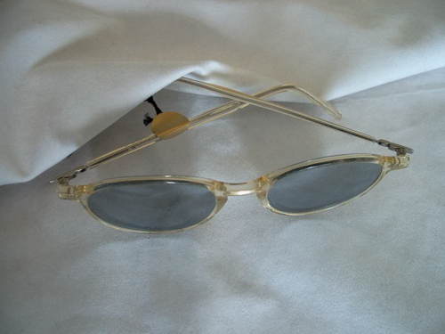 Gli occhiali, in materiale sintetico trasparente, montano lenti specchiate color argento. Recano punzoni all'interno dell'asta sinistra ed all'interno dell'asta destra. [Descrizione estratta dal database del Museo dell'Occhiale].