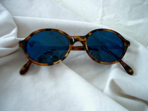 Gli occhiali, in materiale sintetico colorato tipo tartaruga, montano lenti ovali specchiate e colorate in azzurro. [Descrizione estratta dal database del Museo dell'Occhiale].