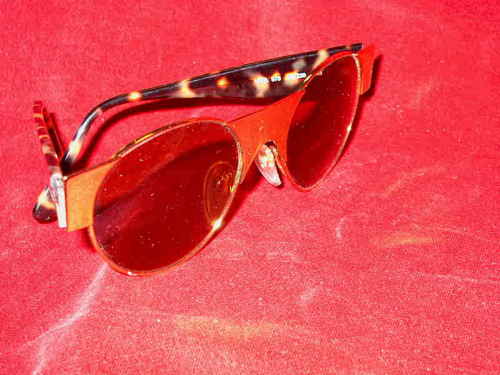 Questi occhiali hanno il frontale in materiale sintetico color oro e le stanghette, sempre in materiale sintetico, colorate ad effetto tartaruga. Le lenti sono colorate in marrone. All'esterno delle astine: V. Sull'astina destra: 140 VALENTINO MADE IN ITALY. Sull'astina sinistra: MOD. 573 52 20 903. [Descrizione estratta dal database del Museo dell'Occhiale].