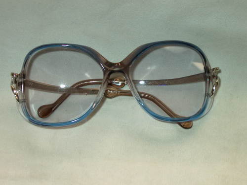 Gli occhiali sono in materiale sintetico colorato nelle sfumature dell'azzurro e le astine in metallo bianco con terminali in plastica caratterizzati da un doppio nodo. All'interno dell'astina sinistra: City Line 181 A 1 All'interno dell'astina destra: 130 54-17. [Descrizione tratta dal database del Museo dell'Occhiale]