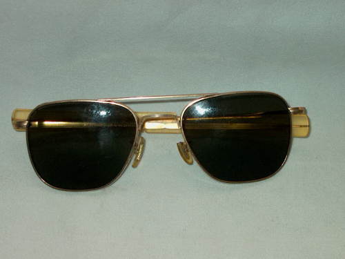 Gli occhiali sono in metallo colorato oro e portano stanghette rigide e lenti colorate in grigio. All'interno dell'astina sinistra: American Optical 1-10-12k GF5 1/2 All'interno dell'astina destra: American Optical 1-10-12k GF5 1/2. [Descrizione estratta dal database del Museo dell'Occhiale].