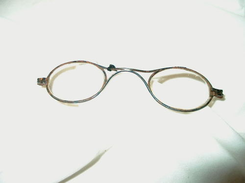 A questi occhiali, in ferro, mancano le astine. Sono presenti diversi attacchi di ruggine. Le lenti sono ovali. Il ponte è a K. [Descrizione estratta dal database del Museo dell'Occhiale].
