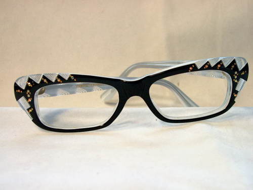 Gli occhiali, in laminato plastica, sono stati elaborati per ottenere effetti geometrici in contrasto tra la tinta nera ed il trasparente. Sono stati inseriti, sul frontale e sulle astine, dei lustrini e degli strass. All'interno dell'astina sinistra: Traviata / 35. All'interno dell'astina destra: Prame "France" R2. [Descrizione estratta dal database del Museo dell'Occhiale].