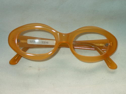 Gli occhiali sono in materiale sintetico colorato effetto tartaruga bionda. All'interno dell'astina destra adesivo: 3230 1106. [Descrizione estratta dal database del Museo dell'Occhiale].