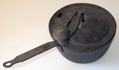 sorta di padella in ferro, chiusa sulla parte superiore, dove vi è un'apertura di forma pressoché ovale, chiusa da un coperchietto fissato con chiodi e dotato di piccola impugnatura in ferro arrotolato. Dal centro della copertura superiore fuoriesce una manovella il cui albero è solidale con due spatole interne, tra loro supplementari, appena staccate dal fondo in modo da ruotare senza entrare in contatto con esso. La manovella esterna è munita di pomolo in legno snodato da azionare a mano. La padella è munita di manico piatto in ferro con foro all'estremità esterna.