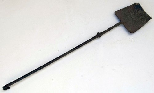 oggetto in ferro battuto composto da un lungo manico dritto a sezione quadra, che verso l'estremità inferiore si allarga in un elemento sporgente tondeggiate e poi si attorciglia su se stesso, per allargarsi in un piano di appoggio leggermente concavo e di forma trapezoidale. L'altra estremità del manico termina con un uncino per poter appendere l'oggetto. Pala coperta di incrostazioni, con segni di ruggine e priva di un angolo.