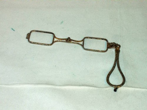 Fassamano in ottone dorato, completamente inciso e con lenti rettangolari. [Descrizione estratta dal database del Museo dell'Occhiale]. Privo di lenti, montatura rettangolare ripiegabile.