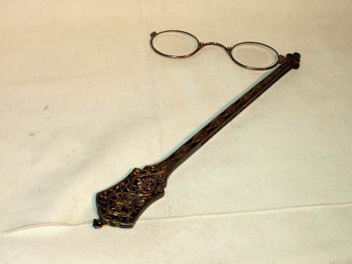Fassamano a impugnatura lunga in ottone dorato. Sull'impugnatura sono inseriti dei fiorellini in ottone su smalto blu. [Descrizione estratta dal database del Museo dell'Occhiale]. Fassamano in ottone dorato con lunga impugnatura decorata a motivi floreali su sfondo a smalto blu. Lenti ovali.
