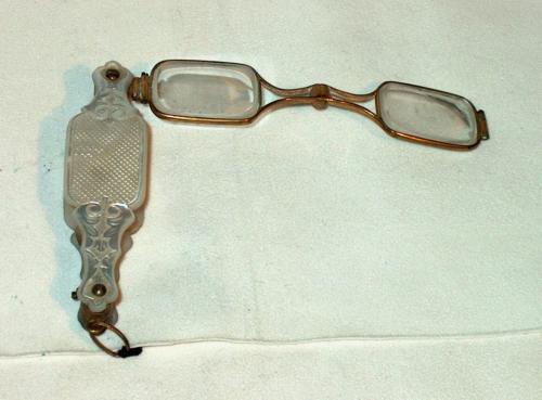 Fassamano piccolo a ciondolo in argento. L'astuccio-impugnatura è in madreperla di forma ovale allungata. [Descrizione estratta dal database del Museo dell'Occhiale]. Fassamano in argento dorato con impugnatura in madreperla incisa a motivi vegetali, di forma rettangolare con terminazioni allungate. Lenti rettangolari.