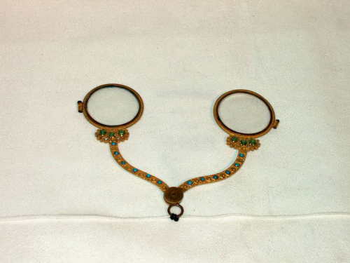 Fassamano a forbice, montato a ciondolo, della serie detta degli "Incroyables". La piacevolezza dell'oggetto, dalla forma essenziale ed usuale, è affidata all'abbinamento dei materiali: infatti la preziosa ed elegante impugnatura è arricchita da turchesi e pietre verdi. Su ogni gambo vi sono sei turchesi per parte (uno manca), e tre pietre verdi. Le lenti hanno due oculari: uno interno in rame ed uno esterno in metallo dorato. [Descrizione estratta dal database del Museo dell'Occhiale].