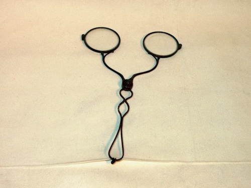 Fassamano (occhiale a forbice) in acciaio brunito con impugnatura. Quest'ultima è fissata con un perno allo snodo delle due lenti. [Descrizione estratta dal database del Museo dell'Occhiale]. Lenti rotonde.