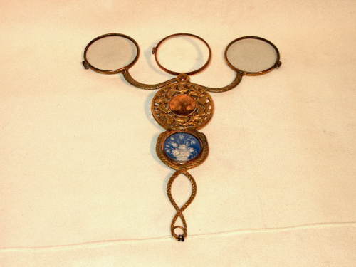 Fassamano a forbice, montato a ciondolo, con preziosa e complessa montatura: i bracci che sorreggono le lenti sono a forma di serpenti, con il perno di chiusura sulla coda. Particolare l'inserimento, sullo stesso perno, di un monocolo che può essere usato da solo o con l'occhiale. Le due lenti e il monocolo si richiudono completamente. L'impugnatura è costituita da due serpenti che, intrecciandosi, sorreggono un disco di rame che funziona da custodia per il monocolo con, al centro, un vaso di fiori di pasta di vetro bianco su fondo azzurro. Più sopra, nel mezzo, un cerchio interamente traforato con una decorazione circolare a motivi floreali, entro il quale si nascondono le due lenti. Sono presenti alcune incrinature sul cammeo in pasta di vetro. [Descrizione estratta dal database del Museo dell'Occhiale].