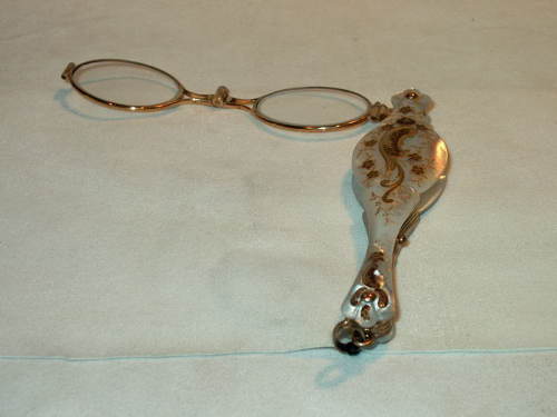 Fassamano con manico lungo in ottone. L'astuccio impugnatura è invece di madreperla con intarsi dorati a volute e fiori. [Descrizione estratta dal database del Museo dell'Occhiale]. Fassamano con impugnatura in madreperla con intarsi vegetali in ottone. Lenti ovali con montatura in ottone.