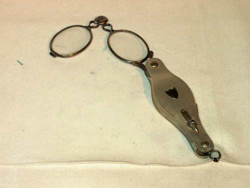 Fassamano a ciondolo con astuccio-impugnatura realizzato in madreperla - lenti rettangolari. Singolare l'apertura a scatto. [Descrizione estratta dal database del Museo dell'Occhiale]. Fassamano in argento con astuccio-impugnatura in madreperla con inserti decorativi in argento. Lenti ovali.