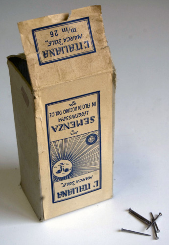 FUNZIONE E MODALITÀ D'USOcontenitore di cartone a base rettangolare; contiene numerose semenze in acciaio, ovvero chiodini utilizzati nella produzione di calzature, in genere per fissare la tomaia o il tacco alla suola